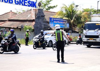 JAVASATU.COM- Satlantas Polres Gresik menertibkan kendaraan angkutan barang bersumbu tiga ke atas di kawasan Bundaran Bunder selama arus mudik Lebaran...