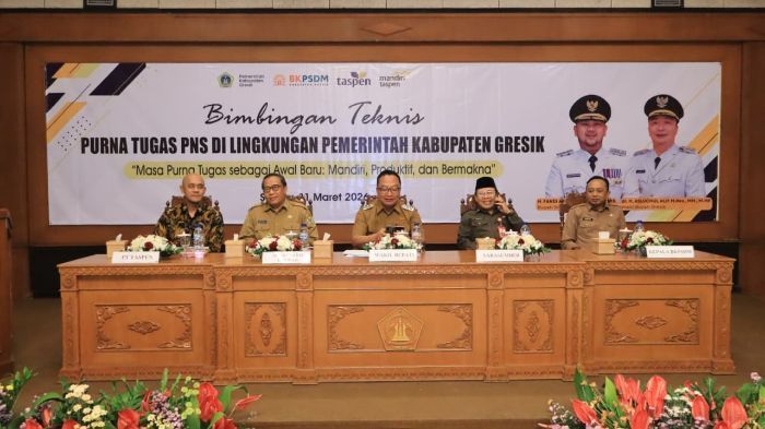 JAVASATU.COM- Sebanyak 230 Pegawai Negeri Sipil (PNS) di lingkungan Pemerintah Kabupaten (Pemkab) Gresik mengikuti Bimbingan Teknis (Bimtek) Purna Tugas sebagai persiapan memasuki masa pensiun periode Mei hingga Desember 2026. Kegiatan digelar di Ruang Mandala Bhakti Praja Kantor Bupati Gresik, Selasa (31/3/2026).