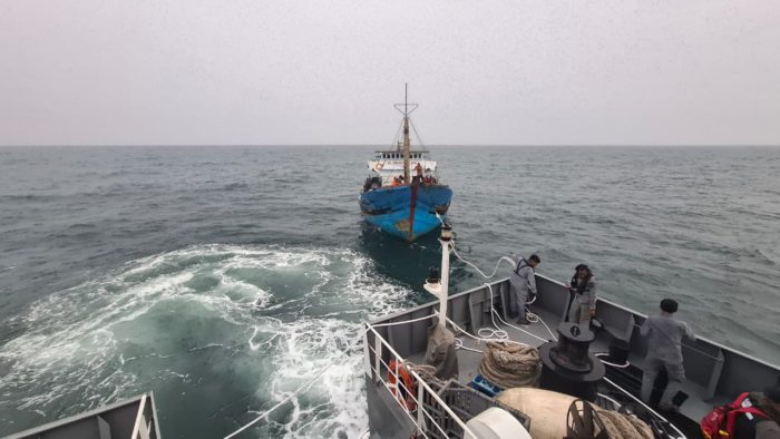 Melihat situasi genting, tim VBSS (Visit, Board, Search, and Seizure) Bakamla RI menurunkan RHIB (Rigid Hull Inflatable Boat) untuk mengirimkan pompa alkon dan menyedot air dari lambung kapal.