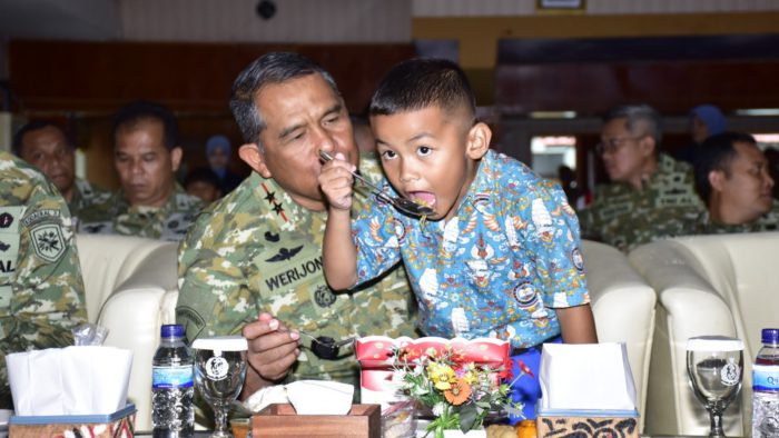 JAVASATU.COM- Momen haru terjadi dalam peringatan Hari Ulang Tahun (HUT) ke-75 Yayasan Hangtuah yang digelar di Aula Samudera Loka Kodaeral X Jayapura, saat Komandan Komando Daerah Angkatan Laut (Dankodaeral) X Mayjen TNI (Mar) Werijon makan satu piring bersama seorang siswa TK Hangtuah Jayapura.