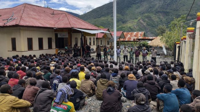 JAVASATU.COM- Aparat gabungan Tentara Nasional Indonesia (TNI) dan Kepolisian Republik Indonesia (Polri) mengawal aksi demo damai perwakilan 20 kampung di Distrik Ilu, Kabupaten Puncak Jaya, Papua Tengah, Jumat (20/2/2026). Aksi yang digelar di halaman Polsek Ilu itu menuntut pembukaan kembali Bandara Ilu hingga layanan publik yang sempat terhenti.