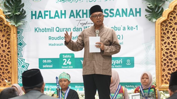 JAVASATU.COM- Wakil Wali Kota Kediri Qowimuddin menekankan pentingnya pendidikan Al-Qur’an sejak usia dini sebagai fondasi pembentukan karakter generasi muda di tengah derasnya tantangan era digital. Hal itu disampaikannya saat menghadiri Haflah Akhirussanah, Tasyakuran Khotmil Qur’an, dan Wisuda Yanbu’a ke-1 Roudlotul Tarbiyatil Qur’an (RTQ) MDT Ula Al-Asy’ari di Yayasan Al-Asy’ari, Kota Kediri, Sabtu (24/1/2026).