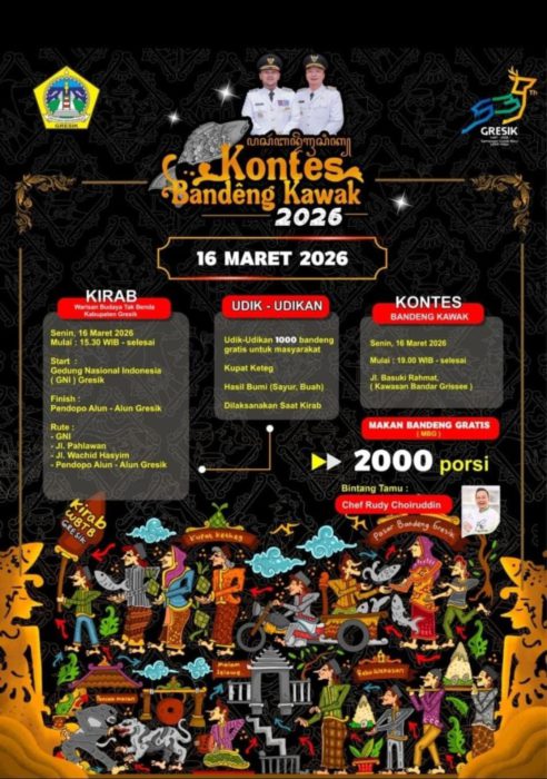 JAVASATU.COM- Pemerintah Kabupaten (Pemkab) Gresik akan menggelar Kontes Bandeng Kawak 2026 pada Senin 16 Maret mulai pukul 19.00 WIB hingga selesai di kawasan Bandar Grissee, Jalan Basuki Rahmat, Gresik. Dalam kegiatan yang menjadi bagian dari tradisi Pasar Bandeng Gresik tersebut, panitia menyiapkan 2.000 porsi makan bandeng gratis bagi masyarakat.
