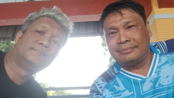 Di sela jeda pertandingan, tokoh masyarakat sekaligus pembina PS Angkasa AU, Lalu Hadi Nursamsi, berdialog dengan perwakilan legenda sepak bola Malang Raya.