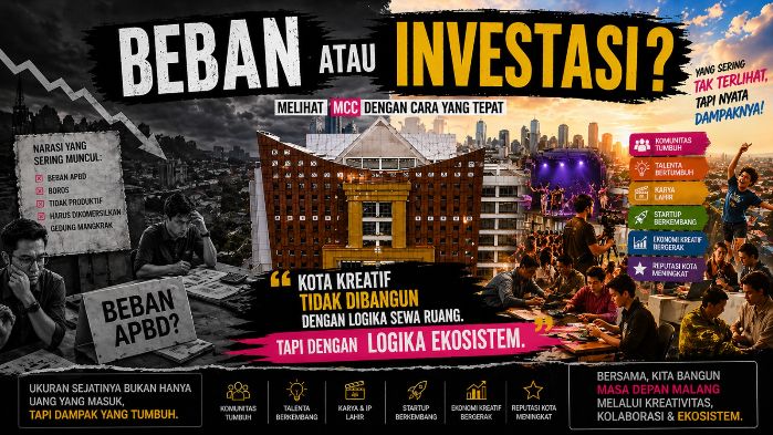 JAVASATU.COM- Status Kota Malang sebagai bagian dari UNESCO Creative Cities Network (UCCN) bidang Media Arts memicu kembali perdebatan soal Malang Creative Center (MCC). Di tengah sorotan biaya operasional yang disebut mencapai miliaran rupiah per tahun, MCC dinilai bukan beban APBD, melainkan investasi jangka panjang untuk ekosistem ekonomi kreatif.