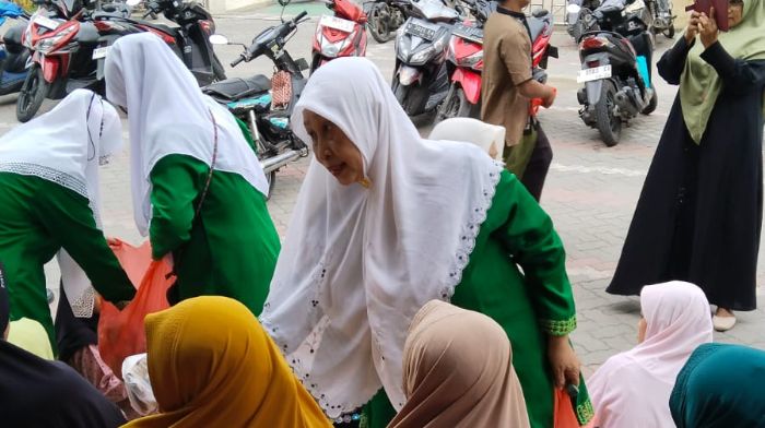 Sejumlah pengurus Muslimat NU tampak mengenakan seragam hijau dan membagikan paket makanan secara tertib.