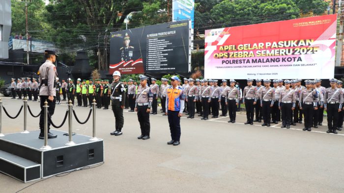 JAVASATU.COM- Polresta Malang Kota resmi menggelar Operasi Zebra Semeru 2025 untuk meningkatkan keamanan, kenyamanan, dan keselamatan berlalu lintas di wilayah Kota Malang. Apel Gelar Pasukan dilaksanakan di halaman Mapolresta Malang Kota pada Senin (17/11/2025), dipimpin Wakapolresta Malang Kota AKBP Oskar Syamsuddin.