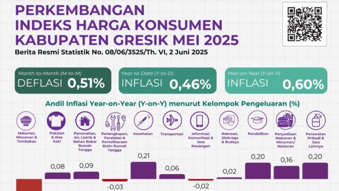 JAVASATU.COM-GRESIK- Badan Pusat Statistik (BPS) Kabupaten Gresik mencatat inflasi year-on-year (yoy) pada Mei 2025 sebesar 0,60 persen. Angka ini menjadi...