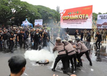 JAVASATU.COM- Polresta Malang Kota menggelar simulasi Sistem Pengamanan Kota (Sispamkota) di depan Balai Kota Malang, Selasa (30/9/2025). Simulasi Sispamkota, Ribuan...