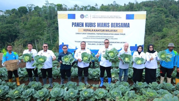 JAVASATU.COM- Lapas Kelas I Malang mencatat capaian membanggakan lewat panen raya kubis sebanyak 20 ton dari lahan pertanian Sarana Asimilasi dan Edukasi (SAE) Ngajum, Selasa (21/10/2025). Hasil panen tersebut bahkan siap menembus pasar ekspor ke Taiwan, menjadi bukti nyata pembinaan warga binaan yang produktif dan bernilai ekonomi tinggi.