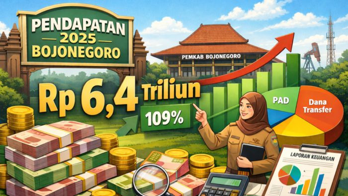 JAVASATU.COM- Pemerintah Kabupaten (Pemkab) Bojonegoro mencatatkan kinerja keuangan positif sepanjang tahun anggaran 2025. Realisasi pendapatan daerah mencapai Rp 6,4 triliun, atau 109 persen dari target awal sebesar Rp 5,8 triliun. Capaian ini menjadi modal kuat Pemkab Bojonegoro dalam melanjutkan pembangunan pada 2026.