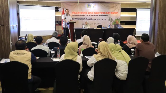 JAVASATU.COM- Sebanyak 20 pengelola destinasi wisata di Kabupaten Gresik mengikuti pelatihan dan sertifikasi kompetensi Badan Nasional Sertifikasi Profesi (BNSP) yang digelar selama dua hari, 8-9 April 2026, di Hotel Horison Gresik. Program ini menjadi upaya pemerintah daerah dalam meningkatkan kualitas sumber daya manusia (SDM) sektor pariwisata.