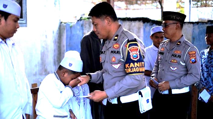 Setelah tausiyah, kegiatan dilanjutkan dengan penyerahan santunan secara simbolis kepada anak-anak yatim oleh Kasat Lantas bersama jajaran anggota Satlantas Polres Gresik.