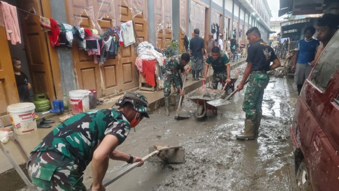 Kehadiran personel TNI di lokasi turut memberi rasa aman dan semangat bagi para pedagang yang terdampak banjir.