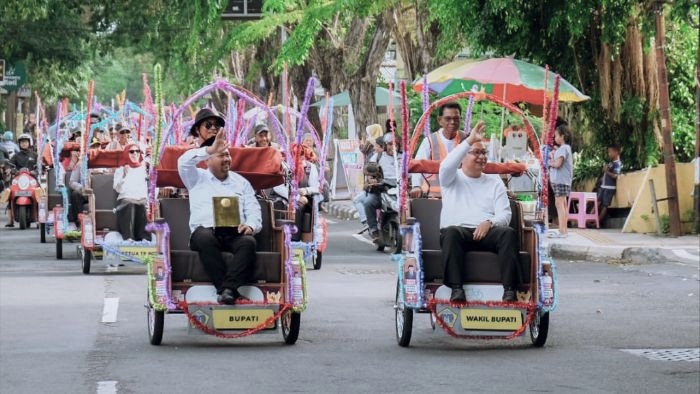Dengan menaiki becak listrik, keduanya memimpin iring-iringan dari Gelora Joko Samudro (GEJOS), melintasi Jalan Veteran, Jalan Panglima Sudirman, Jalan J.A. Suprapto, hingga finis di Wahana Ekspresi Poesponegoro (WEP).