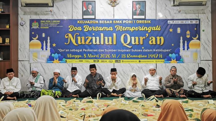 JAVASATU.COM- SMK PGRI 1 Gresik menggelar peringatan Nuzulul Qur’an sekaligus menyalurkan santunan kepada 400 anak yatim piatu pada momentum Ramadan 1447 Hijriah. Kegiatan tersebut digelar di lingkungan sekolah pada Minggu (8/3/2026).