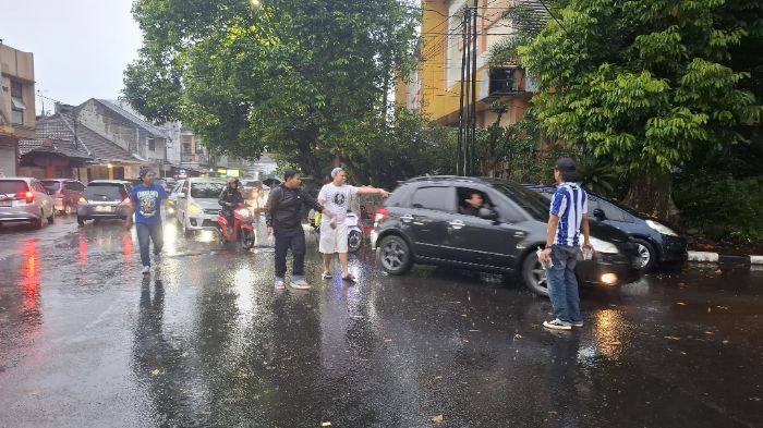 Meski diguyur hujan, para suporter tetap antusias membagikan takjil hingga menjelang waktu berbuka puasa. (nuh)