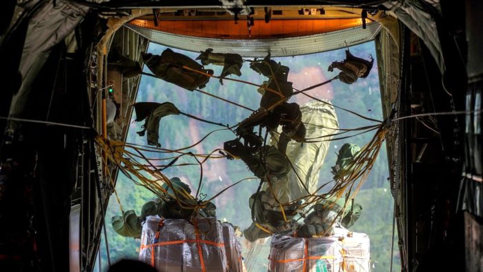 Personel TNI memastikan setiap paket bantuan dijatuhkan dengan presisi pada zona pendaratan yang telah ditentukan.