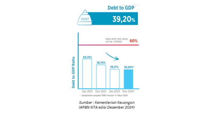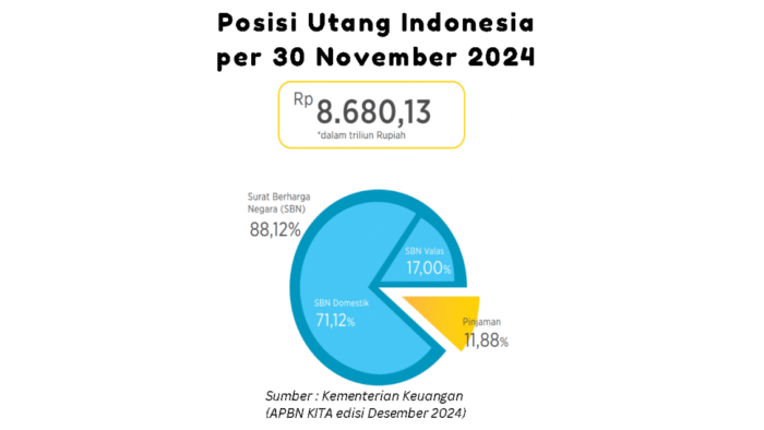 Posisi utang Indonesia per November 2024 tercatat Rp 8.680,13 triliun, mayoritas (71,12%) berupa SBN domestik. Pinjaman luar negeri hanya 11,88%, menegaskan strategi pemerintah mengutamakan pembiayaan dalam negeri untuk mengendalikan risiko fluktuasi nilai tukar dan aliran modal keluar. Rasio utang terhadap PDB (Debt-to-GDP) tercatat 39,2%, masih jauh di bawah batas aman 60% menurut UU No. 17/2003.