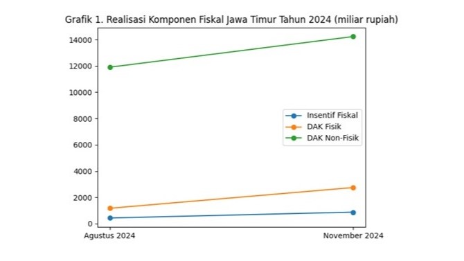Berdasarkan data Kementerian Keuangan Republik Indonesia, realisasi insentif fiskal dan Dana Alokasi Khusus (DAK) di Provinsi Jawa Timur mengalami peningkatan sepanjang tahun 2024. Peningkatan tersebut mencerminkan adanya komitmen pemerintah dalam memperkuat pembiayaan pembangunan daerah. DAK Fisik dimanfaatkan untuk pembangunan infrastruktur pendukung inovasi, seperti fasilitas pendidikan dan sarana teknologi, sementara DAK Nonfisik diarahkan untuk meningkatkan kualitas layanan publik, pendidikan, dan pelatihan.