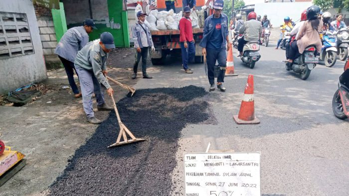 JAVASATU.COM-GRESIK- Untuk meningkatkan keselamatan dan kelancaran arus lalu lintas, tim URC Bina Marga, Dinas Pekerjaan Umum dan Tata Ruang (DPUTR) Kabupaten Gresik pada Senin (27/6/2022) melakukan tambal sulam aspal di ruas jalan Menganti menuju Lakarsantri.