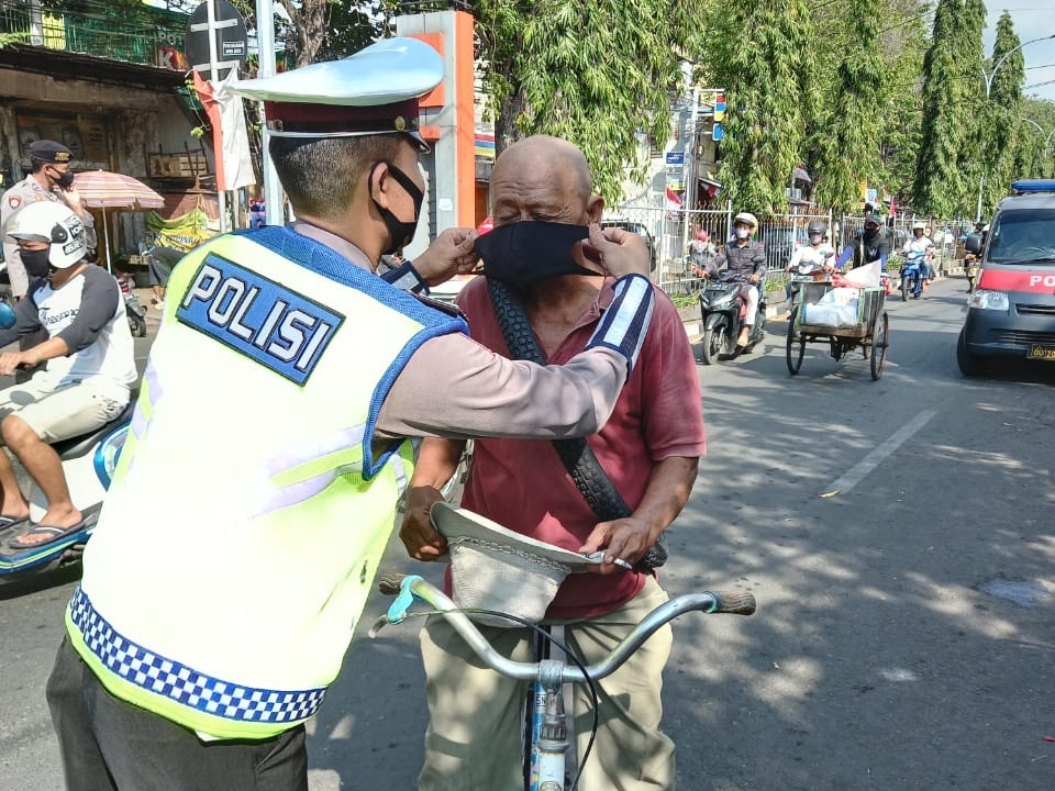 “Untuk hari ini kami bagikan 300 masker kepada masyarakat dan pengguna jalan yang melintas di Simpang Empat Pasar Besar, Jalan Gubernur Suryo, Jalan Usman Sadar dan Jalan KH Kholil” kata Kasatlantas, Minggu (9/8/2020).