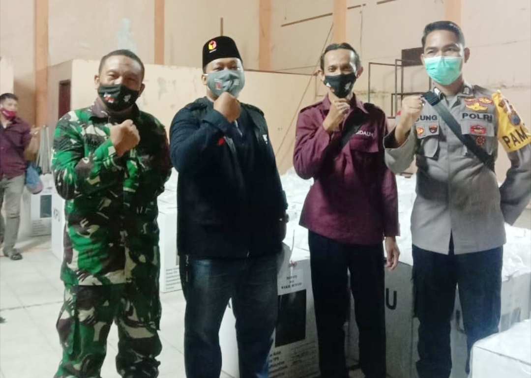 PPK Gresik, Baihaqi (dua dari kanan) bersama petugas TNI Polri saat mengamankan jalannya Pilkada Gresik 2020 di wilayah Kecamatan Gresik. (Foto: Sudasir Al Ayyubi/Javasatu.com)