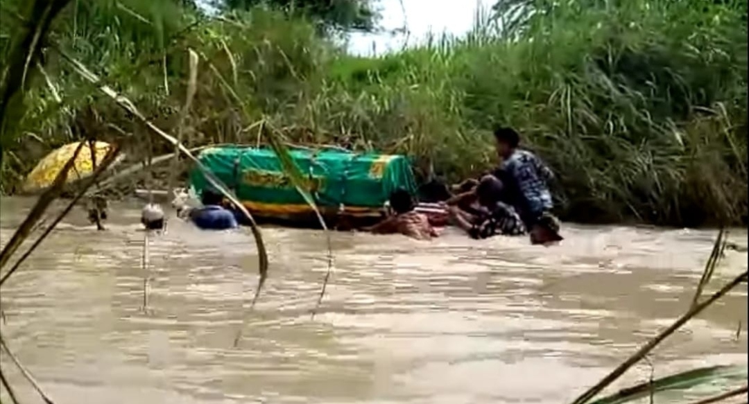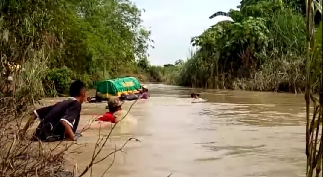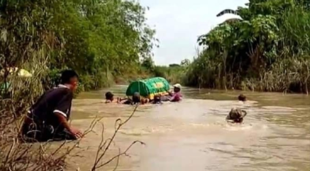 Javasatu,Gresik- Viral di media sosial (medsos) foto warga menyeberangi aliran air sungai yang sangat deras dengan membawa keranda jenazah.