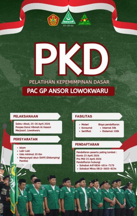 JAVASATU.COM- Pimpinan Anak Cabang (PAC) Gerakan Pemuda (GP) Ansor Kecamatan Lowokwaru, Kota Malang, membuka pendaftaran Pelatihan Kepemimpinan Dasar (PKD) 2026. Program ini menjadi pintu masuk kaderisasi bagi pemuda yang ingin bergabung dan berproses di GP Ansor.