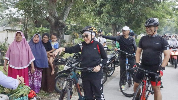 JAVASATU-BOJONEGORO- Bupati Bojonegoro Anna Mu’awanah bersama Dandim 0813 Letkol Arm Arif Yudo Purwanto melakukan olahraga bersepeda atau gowes menikmati hasil pembangunan di wilayahnya, Minggu (30/1/2022).