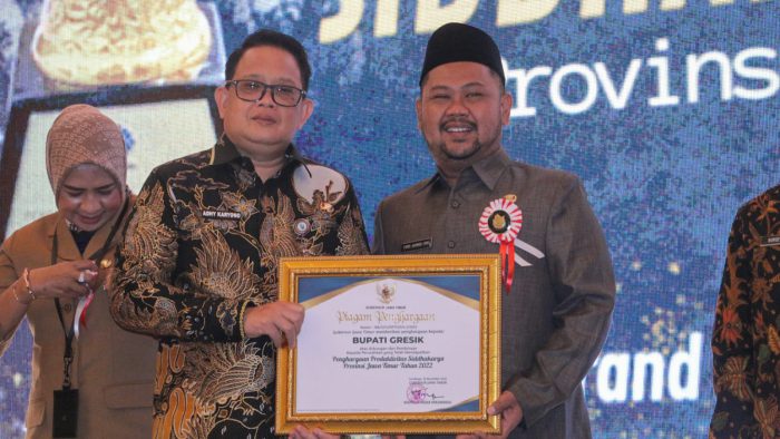 JAVASATU.COM-GRESIK- Bupati Gresik, Fandi Akhmad Yani menerima piagam dan lencana penghargaan dari Pemerintah Provinsi Jawa Timur (Pemprov Jatim). Piagam penghargaan diberikan sebagai apresiasi atas dukungan dan pembinaan Pemerintah Kabupaten (Pemkab) Gresik kepada perusahaan yang telah mendapatkan penghargaan produktivitas Siddhakarya Provinsi Jawa Timur tahun 2022.