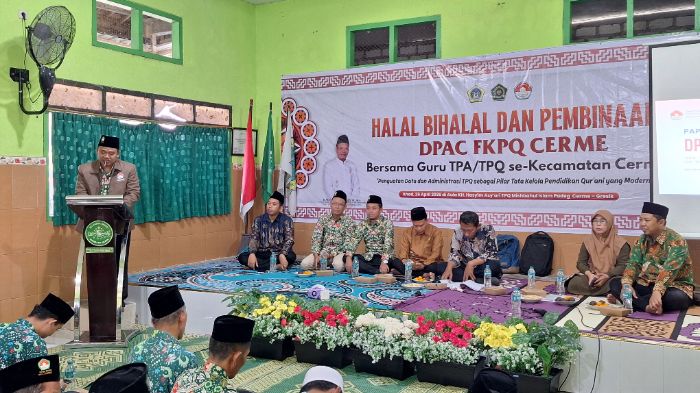 JAVASATU.COM- Halalbihalal Dewan Pimpinan Anak Cabang (DPAC) Forum Komunikasi Pendidikan Al-Qur’an (FKPQ) Kecamatan Cerme Kabupaten Gresik menjadi momentum mendorong guru TPA/TPQ untuk tertib pendataan sekaligus meningkatkan kualitas pendidikan. Kegiatan ini digelar di Aula KH Hasyim Asy’ari TPQ Mishbahul Islam, Desa Padeg, Cerme, Minggu (26/4/2026), dan diikuti sekitar 270 peserta.