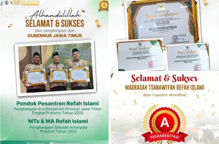 Selain penghargaan Eco Pesantren, MA Refah Islami juga meraih Penghargaan Sekolah Adiwiyata Provinsi Jawa Timur 2025, disusul MTs Islam Terpadu Refah Islami yang mendapatkan penghargaan serupa di tingkat provinsi.