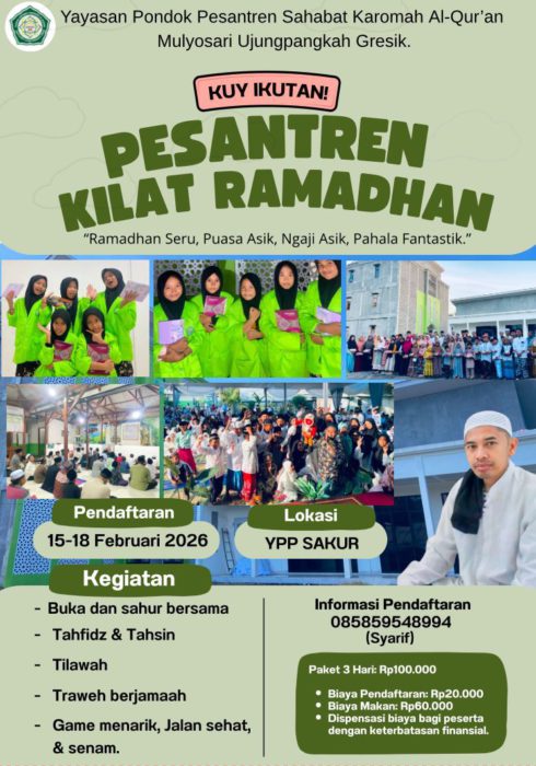 JAVASATU.COM- Pondok Pesantren (Ponpes) Sahabat Karomah Al-Qur’an (Sakur) Mulyosari, Ujungpangkah, Gresik, membuka program pesantren kilat Ramadan 1447 Hijriah untuk jenjang SD/MI. Pendaftaran dibuka pada 15-18 Februari 2026 di kompleks pondok setempat.