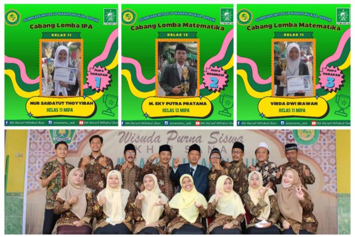 Tiga siswa MA Maarif Miftahul Ulum, Nur Saidatut Thoyyibah (Juara Harapan 1, IPA), Virda Dwi Irawan (Juara Harapan 3, Matematika), dan Muhammad Eky Putra Pratama (Piala Nominasi 2), berhasil melangkah ke babak final dan meraih prestasi gemilang.