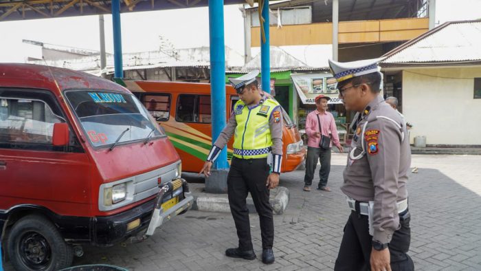 JAVASATU.COM-GRESIK- Satlantas Polres Gresik melakukan cek kelayakan kendaraan angkutan umum dan himbauan ke sopir angkutan umum di terminal kota Gresik, Senin (8/5/2023). Tujuannya untuk mencegah kecelakaan lalu lintas.