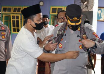 JAVASATU.COM-GRESIK- Kapolres Gresik, AKBP Mochamad Nur Azis terkejut karena tiba-tiba dikalungi sorban saat meninjau vaksinasi booster di Pondok Pesantren As...