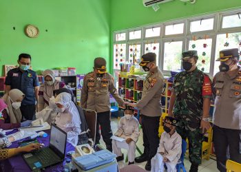 JAVASATU-GRESIK- Wakapolda Jawa Timur (Jatim) Brigjen Pol Slamet Hadi Supraptoyo meninjau pelaksanaan vaksinasi anak usia 6-11 tahun di SDN 51...
