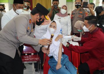 JAVASATU-GRESIK- Kapolda Jawa Timur Irjen Pol Nico Afinta meninjau vaksinasi di SMA Negeri 1 Gresik. Sebanyak 1.249 pelajar di SMA...