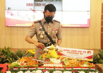 JAVASATU-MALANG- Kapolres Malang AKBP Bagoes Wibisono melakukan pemotongan tumpeng dan kue ulang tahun secara simbolis, dalam rangka perayaan HUT ke-73...
