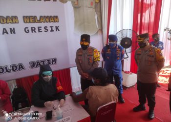 JAVASATU-GRESIK- Kapolda Jatim Irjen Pol Nico Afinta, meninjau pelaksanaan vaksinasi merdeka di Satpolairud Polres Gresik, Selasa (3/8/2021). Sebanyak 900 dosis...