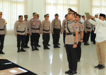JAVASATU.COM-GRESIK- Kapolres Gresik AKBP Adhitya Panji Anom memimpin sertijab dan sumpah jabatan di Aula Wicaksana Laghawa Mapolres Gresik, Senin (4/9/2023). AKP...