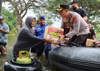 JAVASATU.COM-GRESIK- Kapolres Gresik AKBP Adhitya Panji Anom bersama Bupati Gresik Fandi Akhmad Yani mengendarai perahu menyalurkan bantuan kepada korban banjir...
