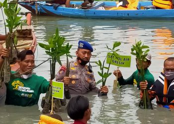 JAVASATU.COM-GRESIK- Dalam rangka hari Perhubungan Nasional ke 52 serta peduli lingkungan, sebanyak 50 personel Polairud Polres Gresik menanam pohon Mangrove...
