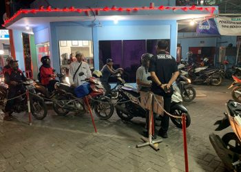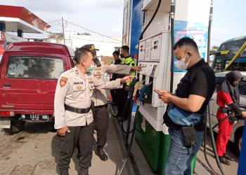 JAVASATU.COM-GRESIK- Pemerintah resmi menaikkan harga BBM, termasuk Pertalite, Solar dan Pertamax. Petugas Polres Gresik saat komunikasi dengan warga pembeli BBM...