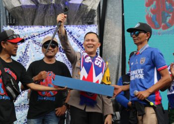 JAVASATU.COM-MALANG- Aremania berikan kejutan bagi Kapolres Malang, AKBP Ferli Hidayat dalam acara peresmian patung kepala singa bernama 'Tegar Arema Jawara'...