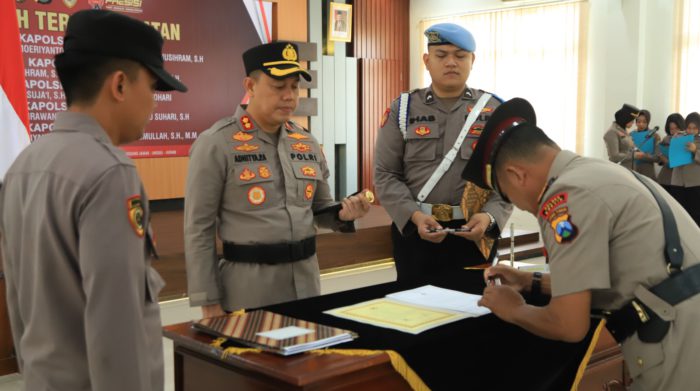 Dalam sambutannya, Kapolres Gresik menyampaikan ucapan terima kasih kepada pejabat lama atas dedikasi dan pengabdiannya selama menjabat di Polres Gresik.