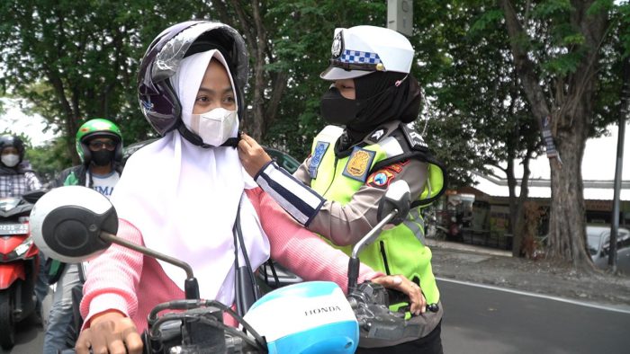 Sejumlah pengendara yang tak mengenakan helm tampak kaget saat disetop petugas.namun senyum, sapa dan salam dari anggota Satlantas mencairkan suasana dan melegakan pengendara.
