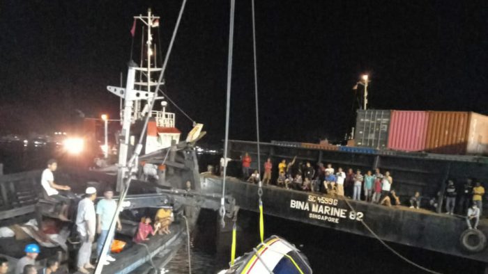 JAVASATU.COM- Bakamla RI melalui unsur KN. Sarotama – P.112 milik Kesatuan Penjaga Laut dan Pantai (KPLP) yang tergabung dalam Patroli Bersama Bakamla RI tahun 2023 melaksanakan evakuasi korban kapal SB Evelin Calisca 01 yang terbalik akibat menabrak Tunggul Nipah yang hanyut di perairan Sungai Tawar, Kecamatan Kateman, Kabupaten Indragiri Hilir, Riau, Jumat (28/4/2023).