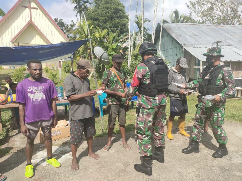 JAVASATU-KEEROM- Anggota Pos Kalilapar Satgas Pamtas RI-PNG Yonif Mekanis 512/QY memberikan sosialilasi Protokol Kesehatan (Prokes) dan membagikan masker kepada warga...